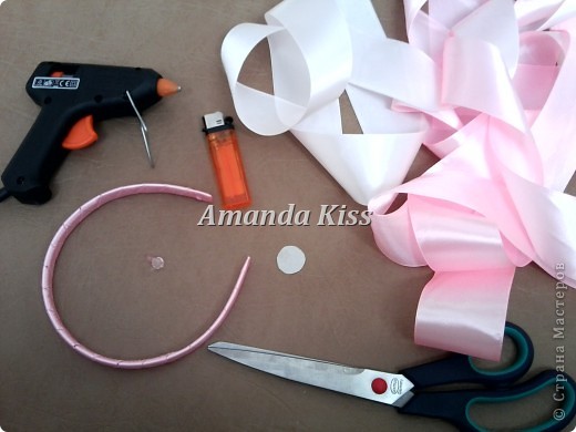 Необходимы следующие материалы: клеевой пистолет, зажигалка, ленты, ножницы, небольшой кружок картона (примерно d=1-1,3см) и сам ободок. У меня он уже оплетен 2мя лентами одного цвета. МК оплетания я уже выкладывала здесь